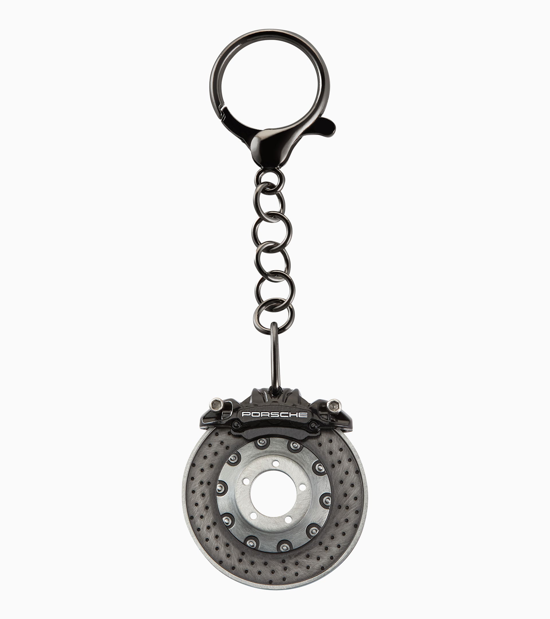 Design, that's guaranteed to keep the pace: Porsche key ring in a faithful replica of a brake disc. The brake disc is rotatable and compatible with all Porsche vehicle keys. Ø 3.5 cm. Made in Germany.