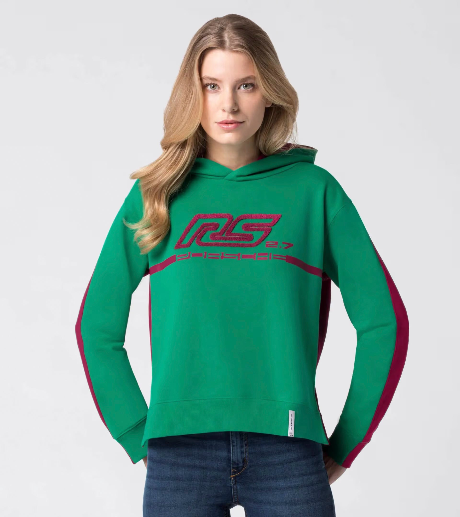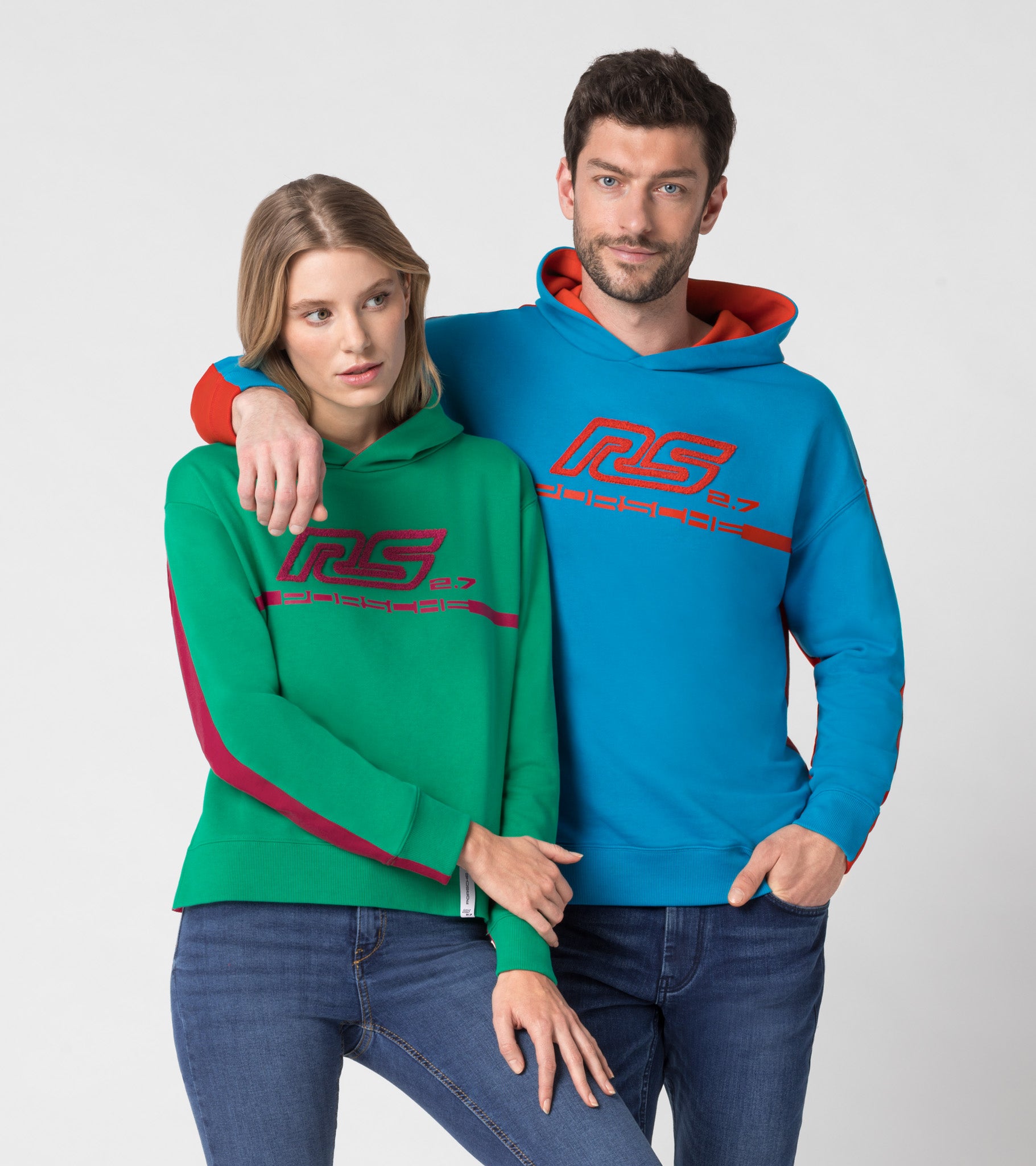 Casual and comfortable: Women's hoodie with RS 2.7 terrycloth embroidery and Porsche print. The colours are inspired by the 911 Carrera RS 2.7, which was introduced in 1972 at the Paris Motor Show.