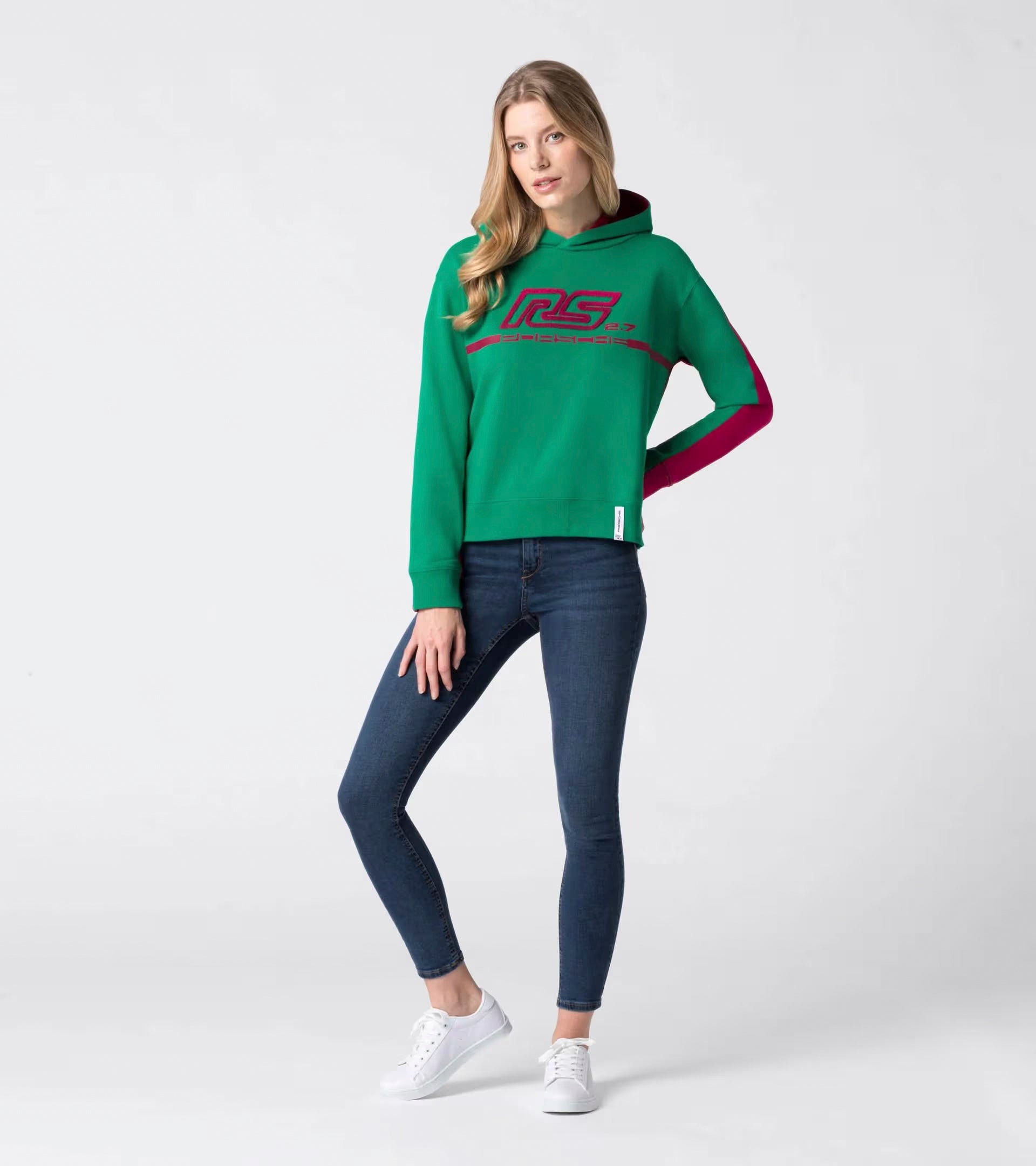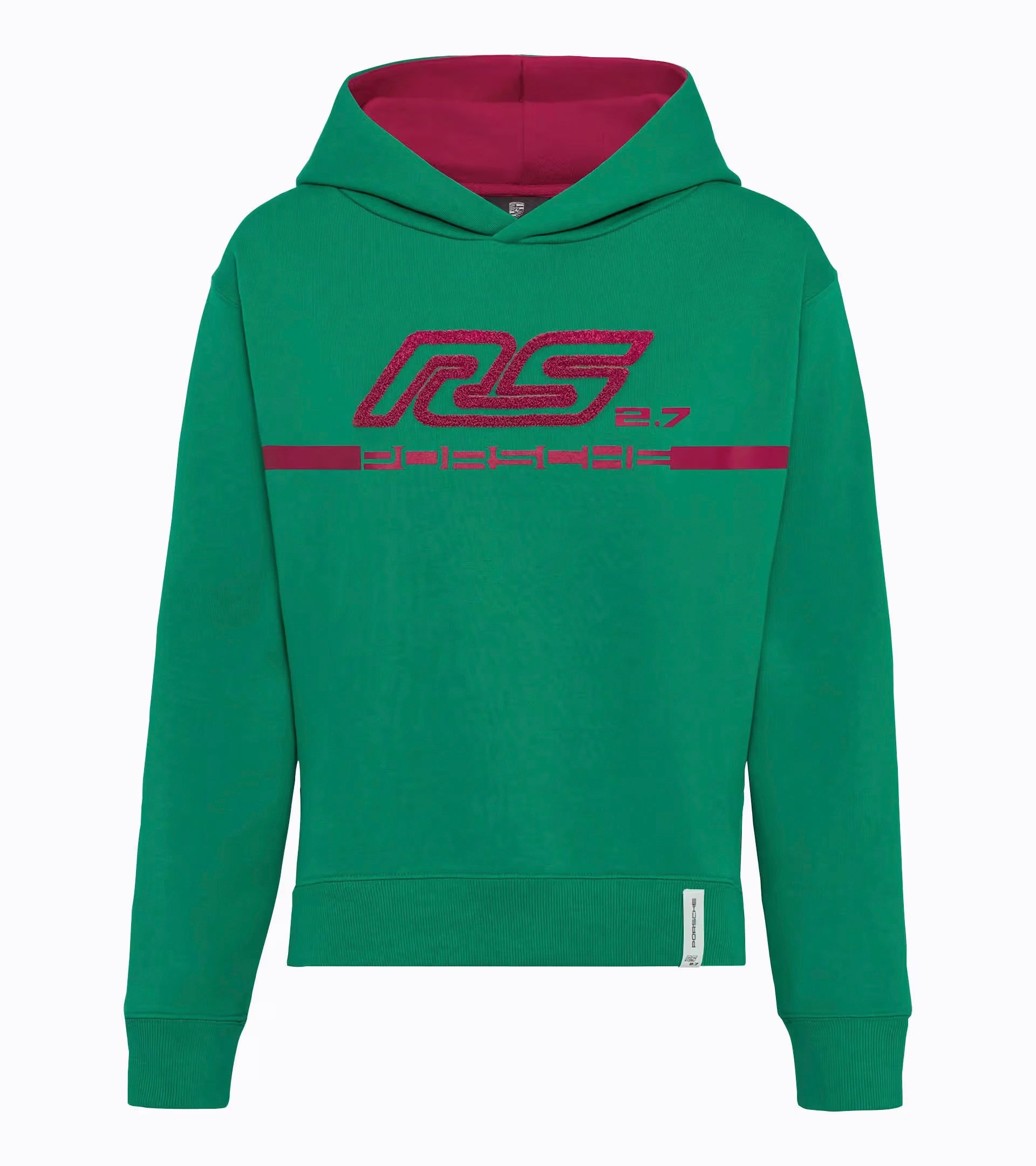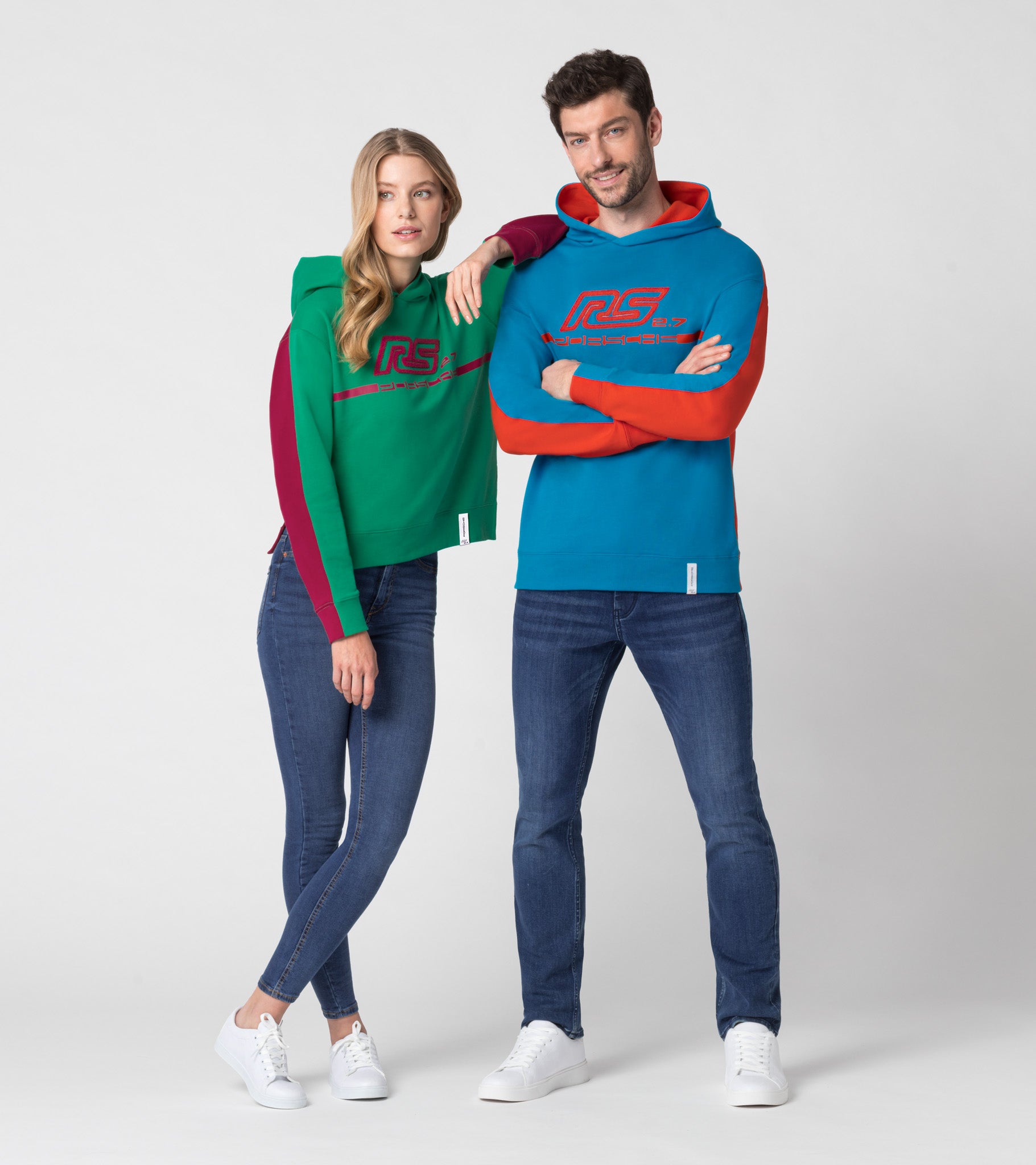 Casual and comfortable: Women's hoodie with RS 2.7 terrycloth embroidery and Porsche print. The colours are inspired by the 911 Carrera RS 2.7, which was introduced in 1972 at the Paris Motor Show.