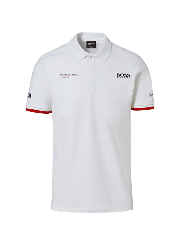 Short-sleeved polo shirt in piqué with three buttons and ‘PORSCHE MOTORSPORT’ signet. Design based on the original Porsche Motorsport team clothing. With ‘PORSCHE’ logo on the shoulder yoke.