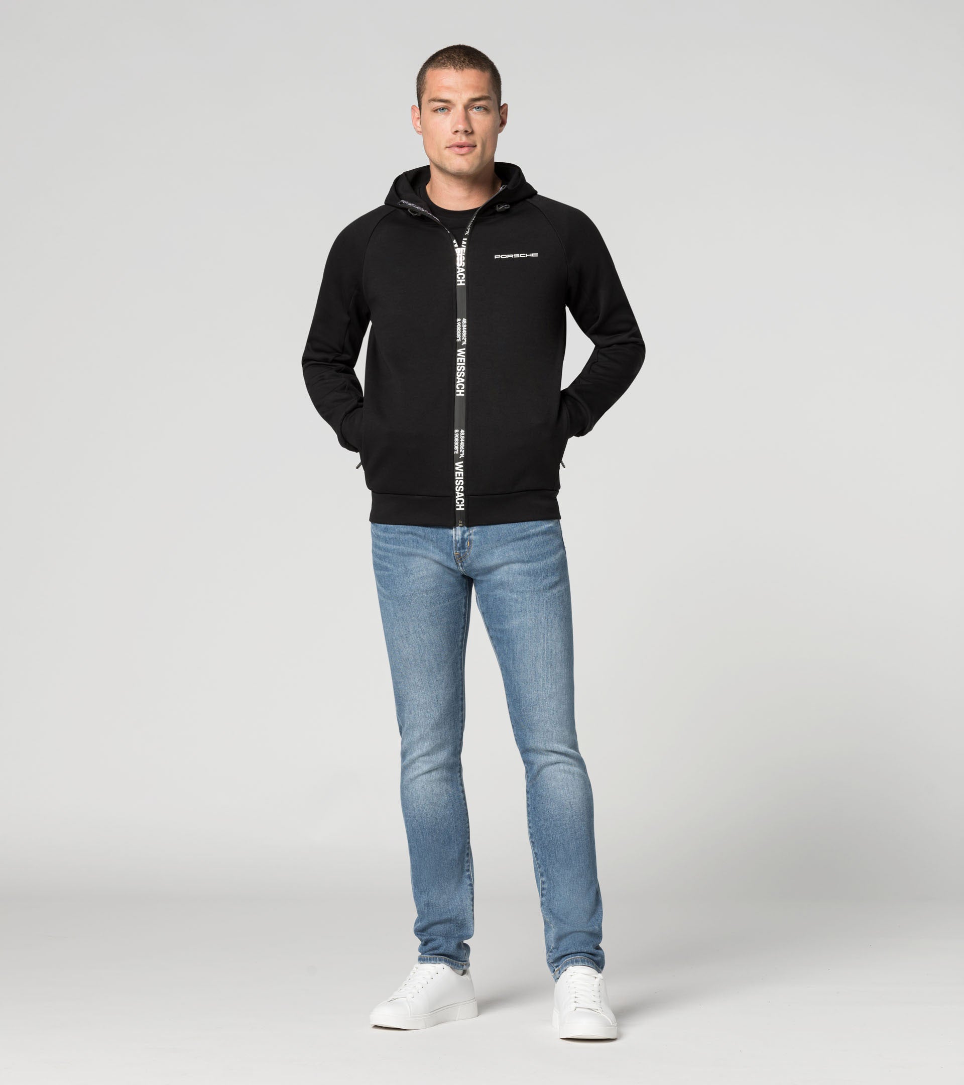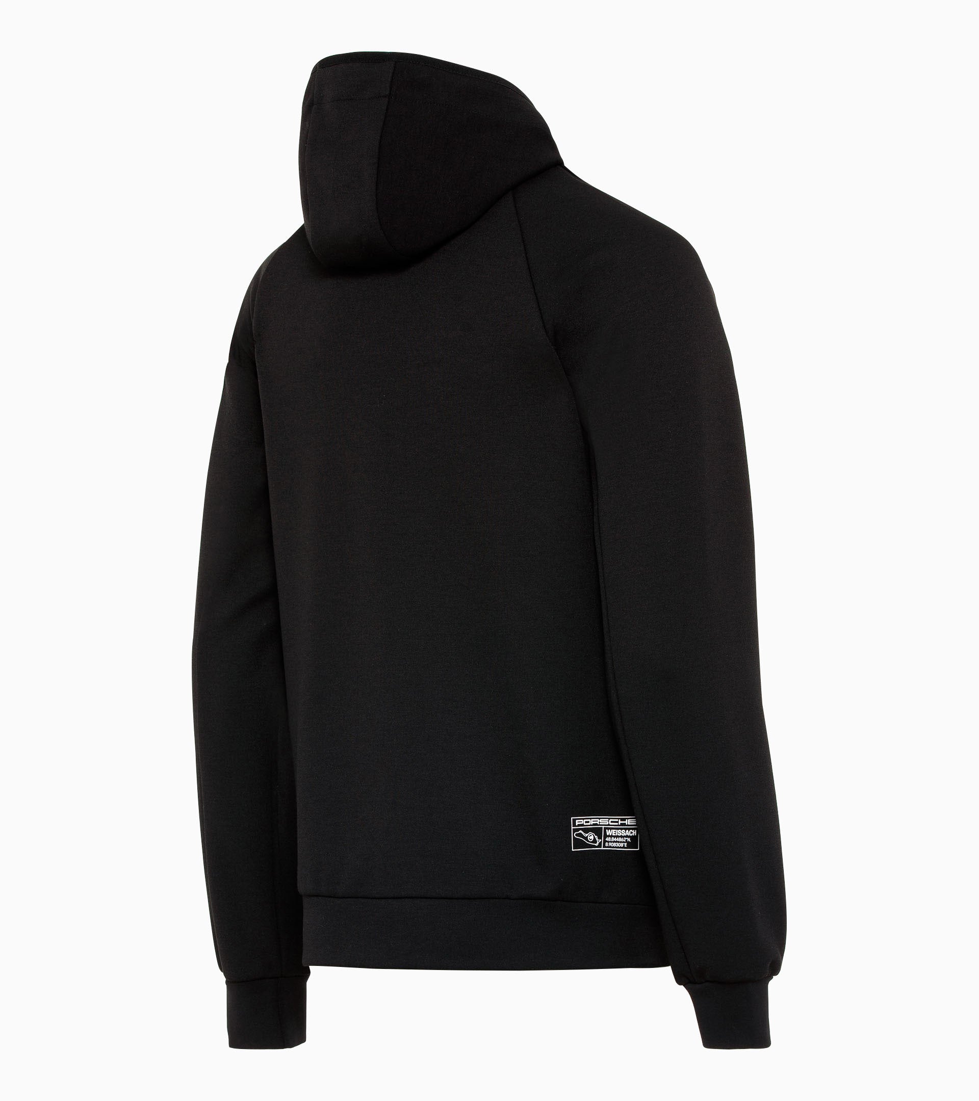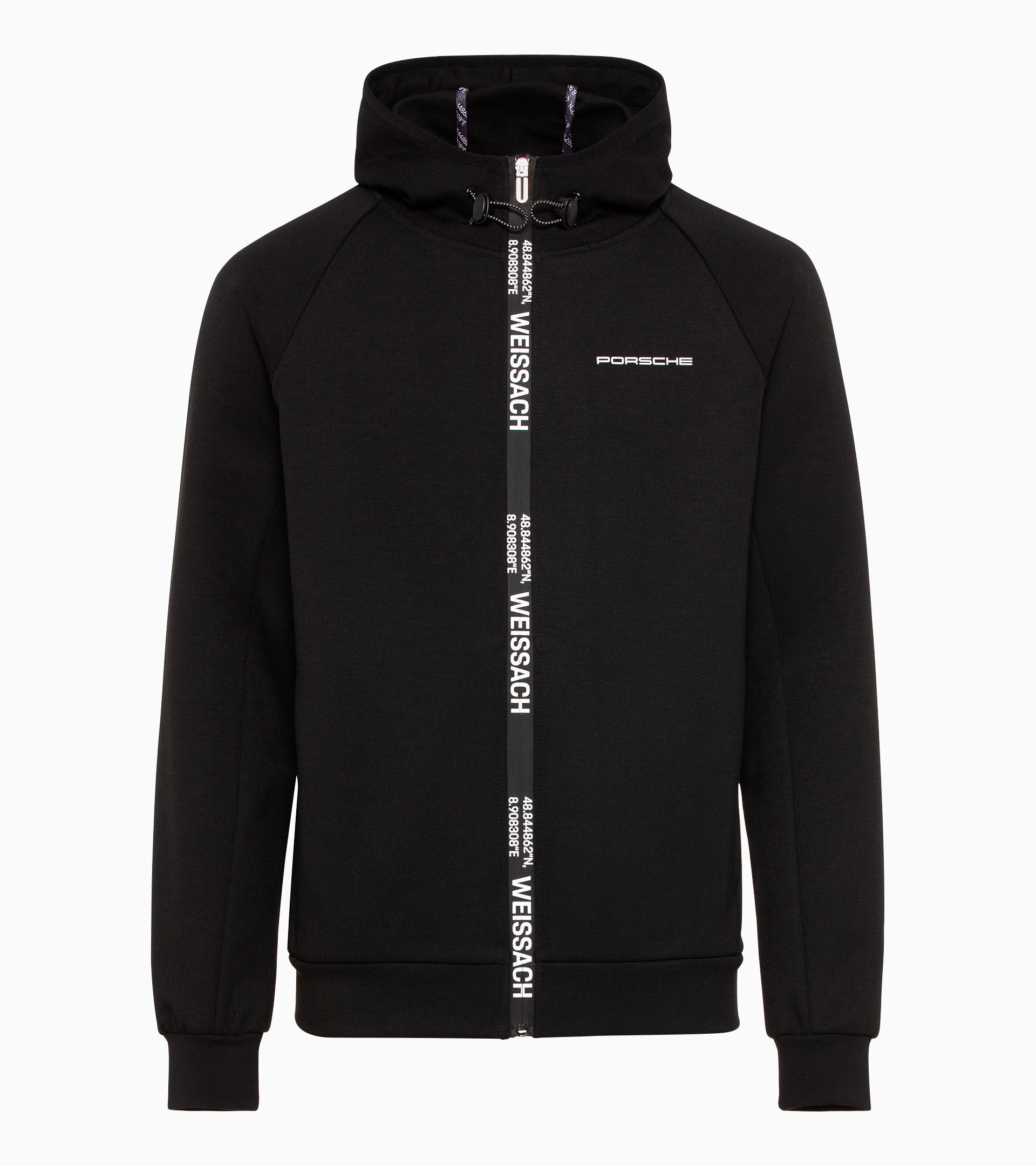 High-quality look and feel: the Porsche sweat jacket from the Essential collection. The sweat jacket has a Weissach logo and the Weissach coordinates on the taped zip. The front features a 3D silicone print of the Porsche logo on the chest. Another print on the lower back shows an image of the Weissach test track. Zipped hand pockets offer space for keys and a smartphone.