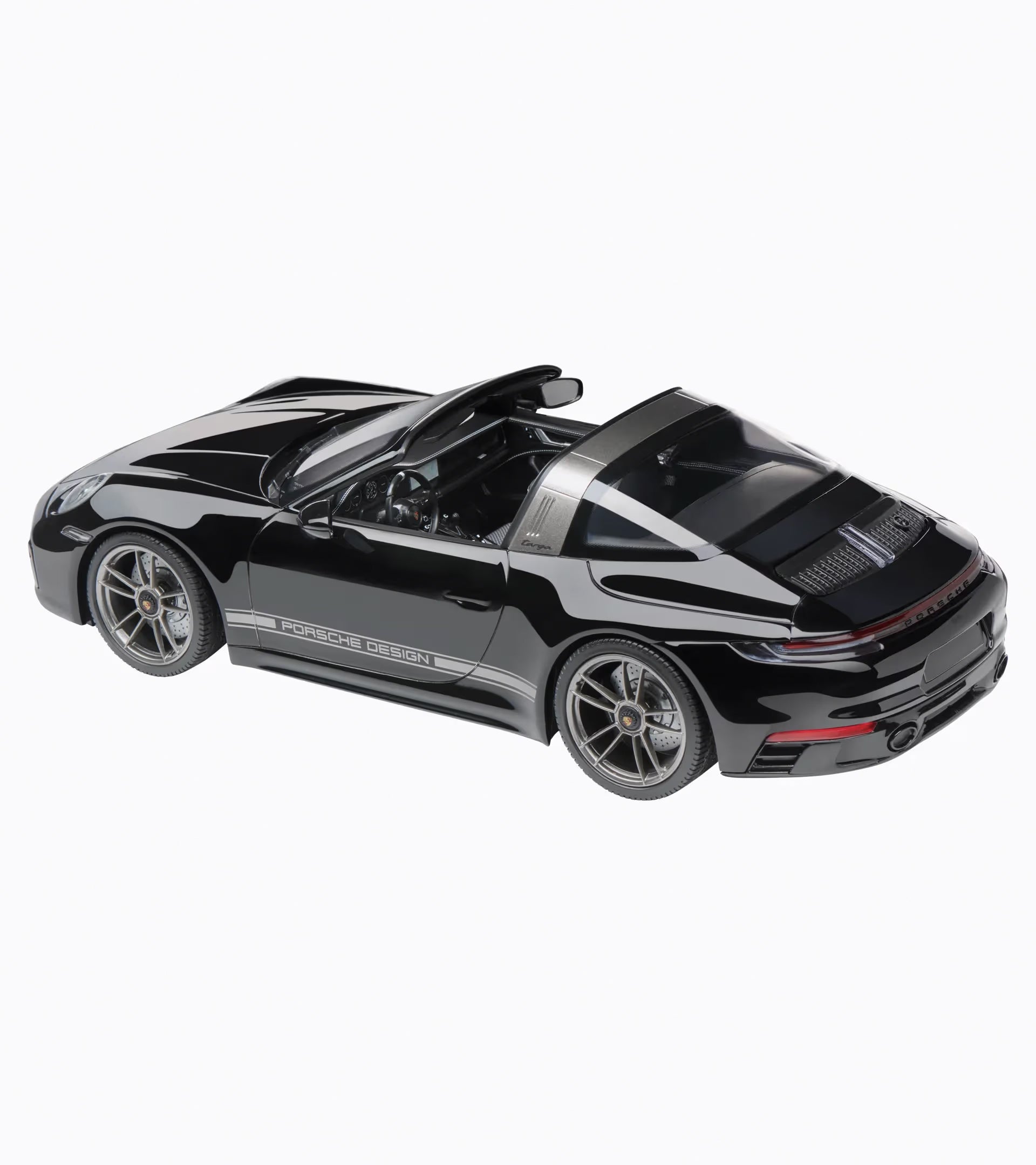 The exclusive 1:18 scale model of the Porsche 911 Targa 4 GTS 992 50 Years of Porsche Design Edition showcases impressive attention to detail and deserves its place in any collection. The packaging provided also makes it the perfect gift for all Porsche fans. Die-cast. Black exterior, Black interior.
