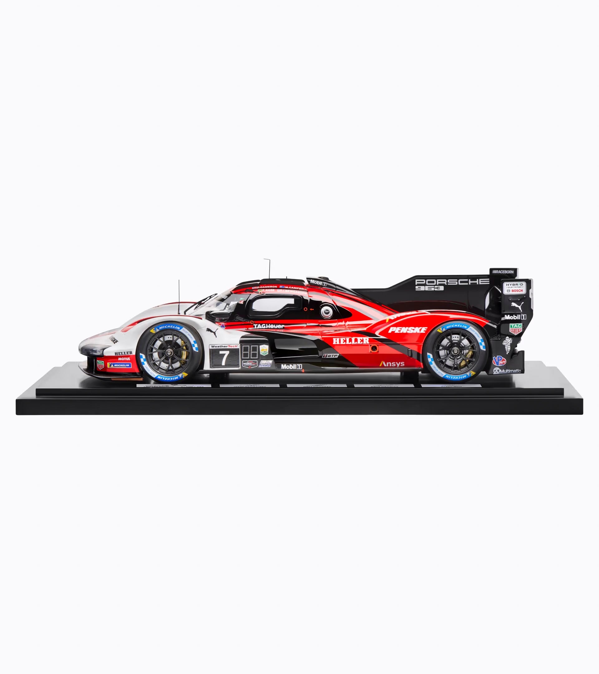The exclusive 1:18 scale model of the Porsche 963 showcases impressive attention to detail and deserves its place in any collection. The packaging also makes it the perfect gift for all Porsche fans. Made of resin. White/Red/Black exterior, Black interior.